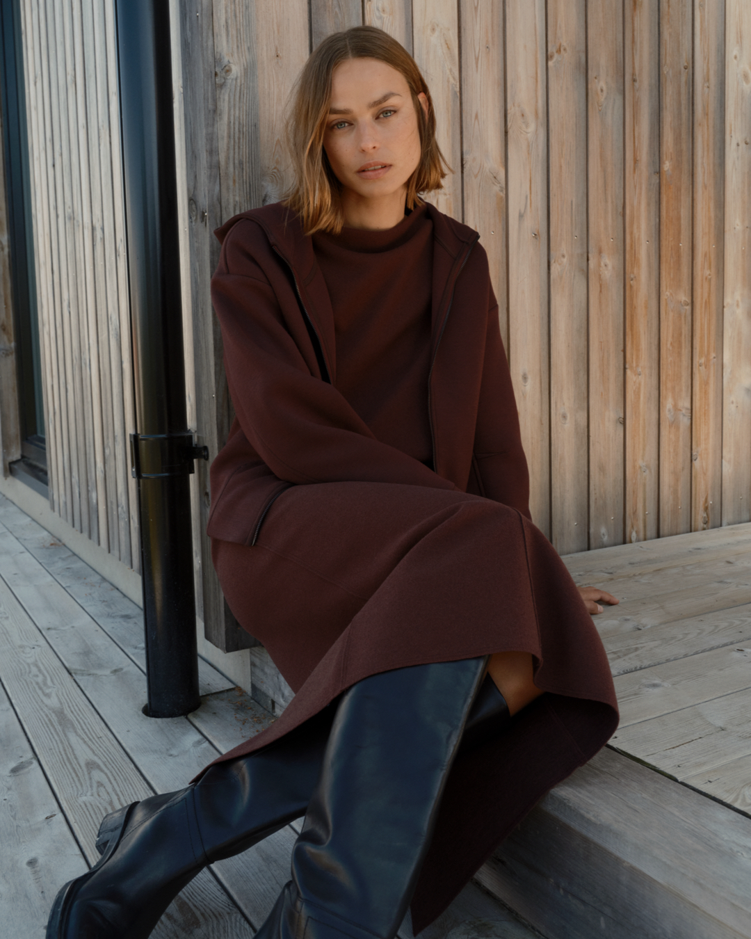 Das monochrome Hoodie-und-Rock-Duo bringt nordisch inspirierte Lässigkeit in den Winter. Chunky Boots und ein Oversized-Shopper machen den Look ready für City oder Countryside. #opusfashion