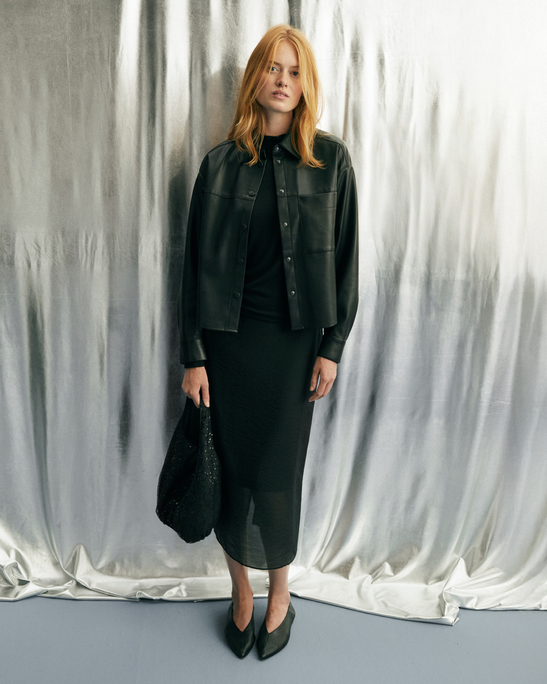 Glatte Lederimitat-Bluse überzeugt als vielseitiger Hybrid und lässt sich sowohl klassisch geschlossen als auch offen als Overshirt tragen. Der butterweiche Griff und die cleane, moderne Optik machen sie zum idealen Begleiter für einen femininen, unkomplizierten Alltagslook. #OpusFashion