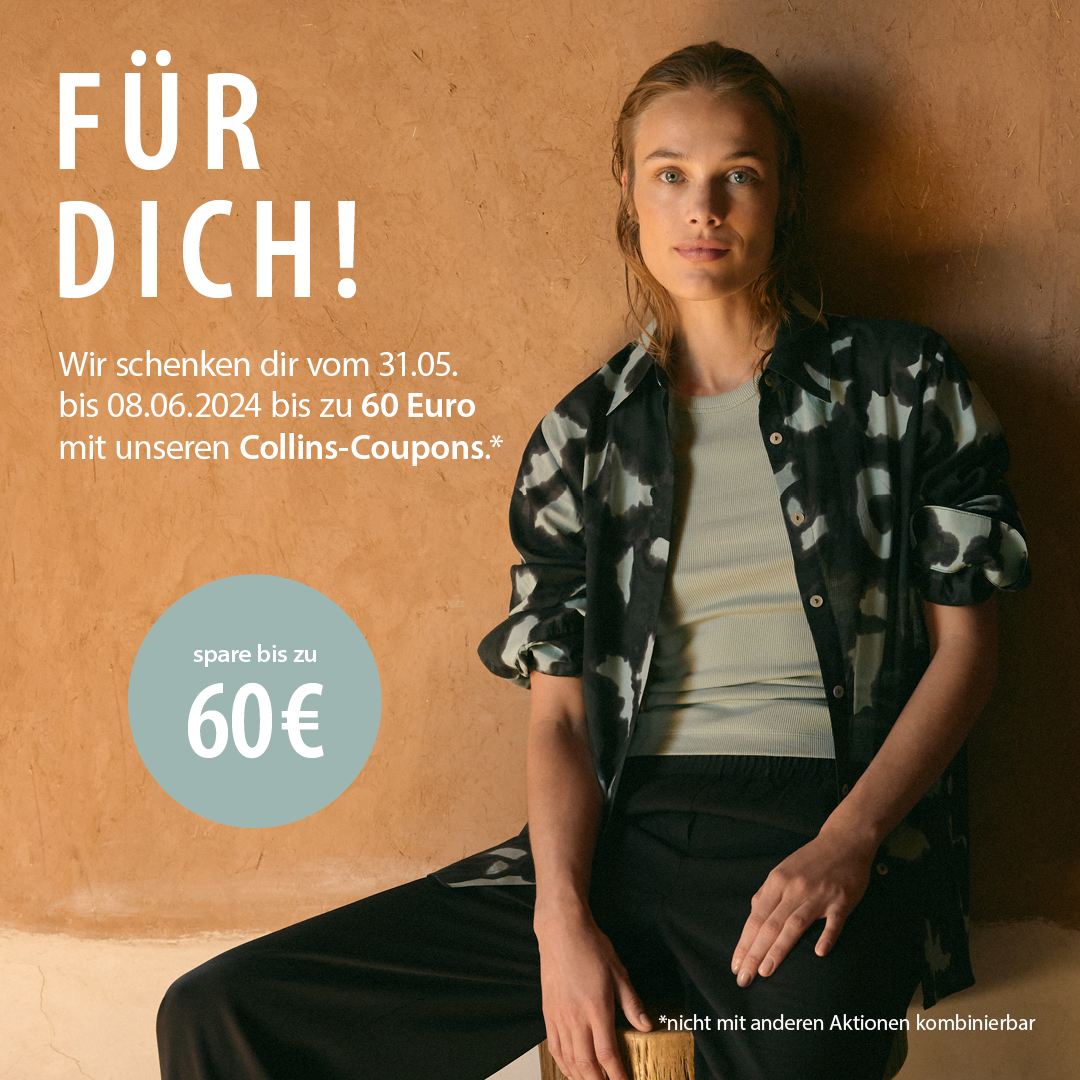 Wir schenken dir vom 31.5. bis zum 08.06.24 bis zu 60€ mit unseren COLLINS* Coupons.. Schau rein… Wir freuen uns auf dich. Dein COLLINS* Team