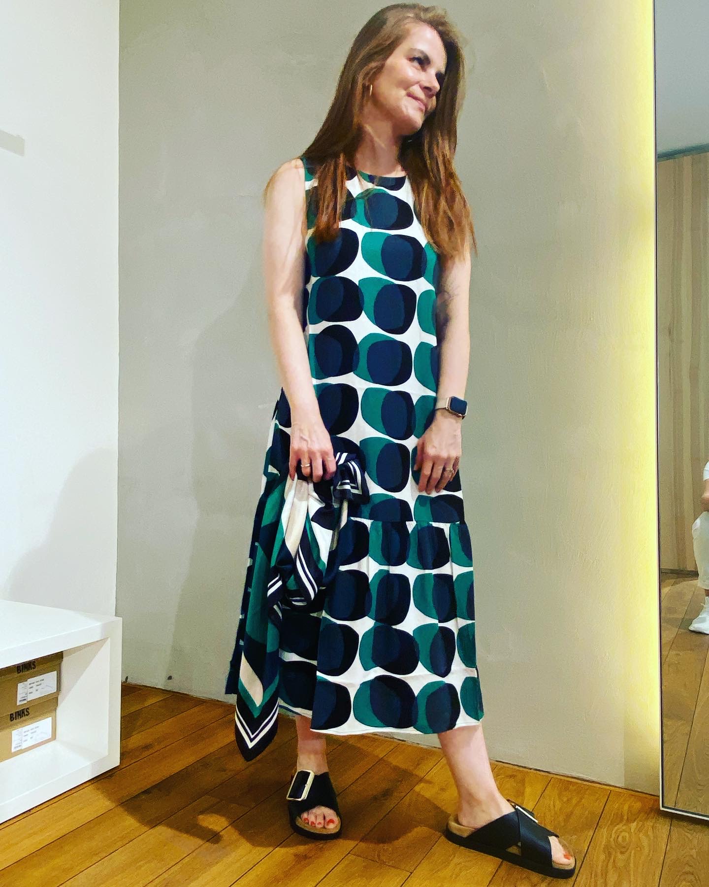…be mindful mit ECOVERO VISKOSE !! Das wunderschöne Kleid mit grafischen Retrodruck & der fließender Ware überzeugt bei dem warmen Temperaturen mit tollem Tragegefühl 👌 #shopthelook #ootd#retro #ecovero