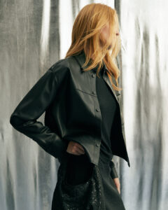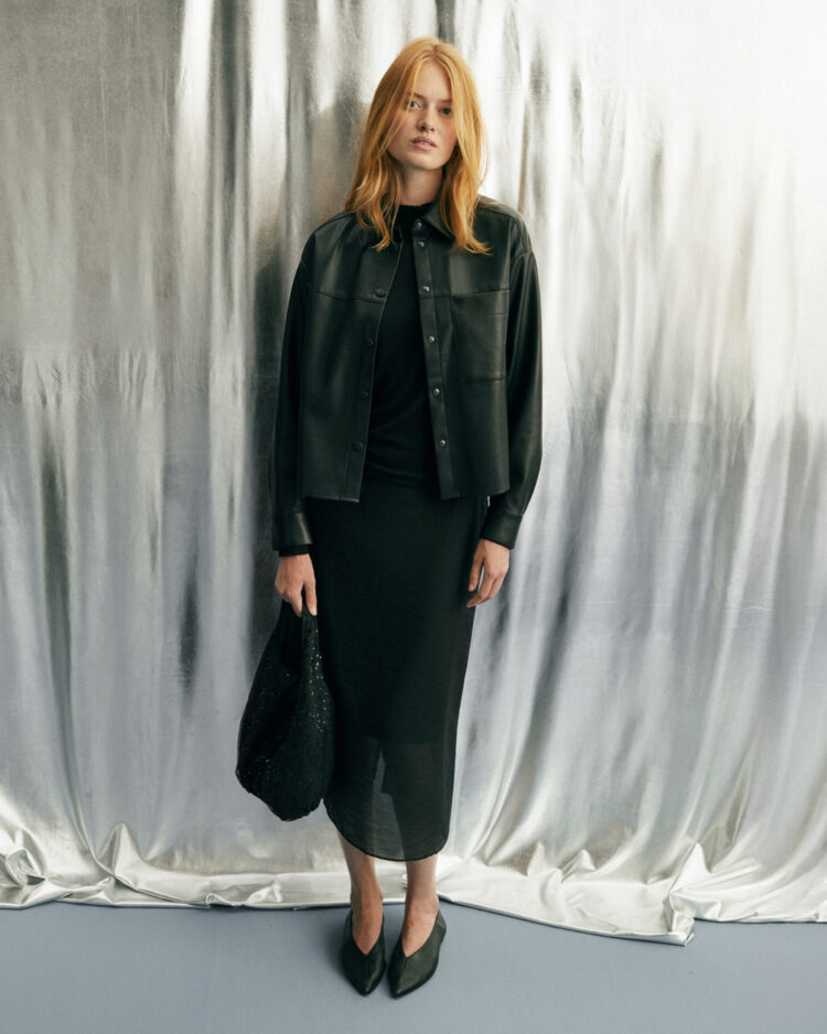 Glatte Lederimitat-Bluse überzeugt als vielseitiger Hybrid und lässt sich sowohl klassisch geschlossen als auch offen als Overshirt tragen. Der butterweiche Griff und die cleane, moderne Optik machen sie zum idealen Begleiter für einen femininen, unkomplizierten Alltagslook.