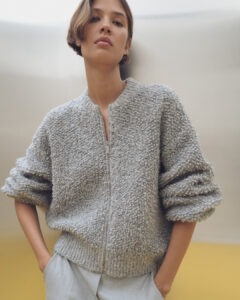 Der weiche Blouson aus Bouclé-Strick zeigt sich mit markanter Knötchenstruktur und voluminöser Oberfläche. Die Kombination aus Strickbündchen und Teddy-Effekt macht ihn zur stilvollen Wintervariante für urbane Looks.
