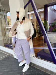 Lässige Cordhose im Jogger Style, die individuell durch den Umschlag in der Breite zu variieren ist.Kombiniert mit einer flauschigen Strickjacke und passende Accessoires.