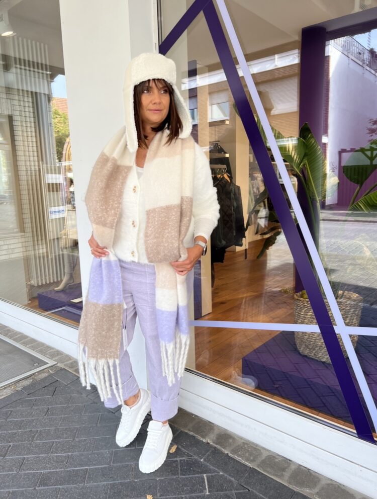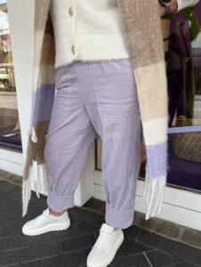 Lässige Cordhose im Jogger Style, die individuell durch den Umschlag in der Breite zu variieren ist.Kombiniert mit einer flauschigen Strickjacke und passende Accessoires.